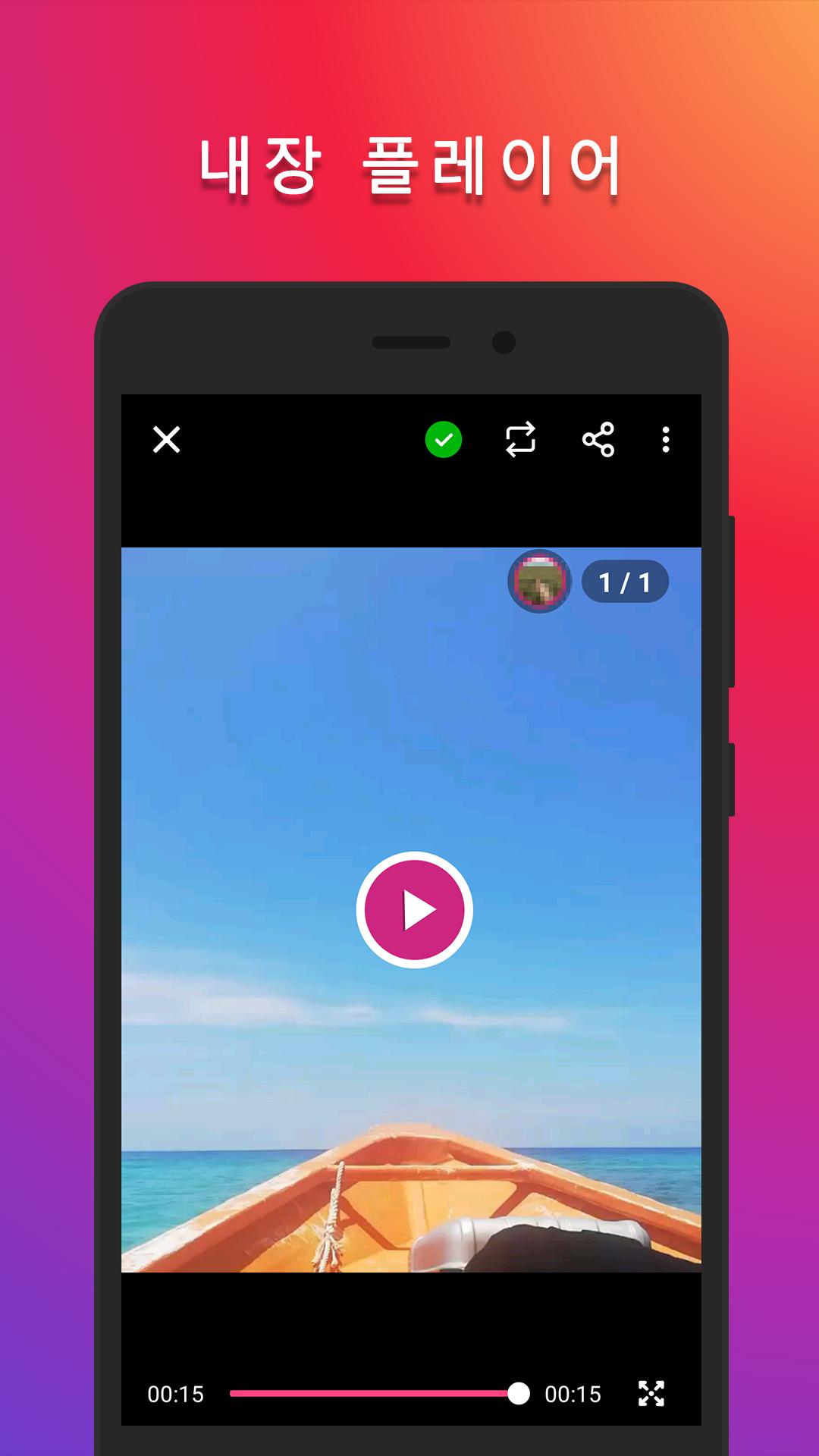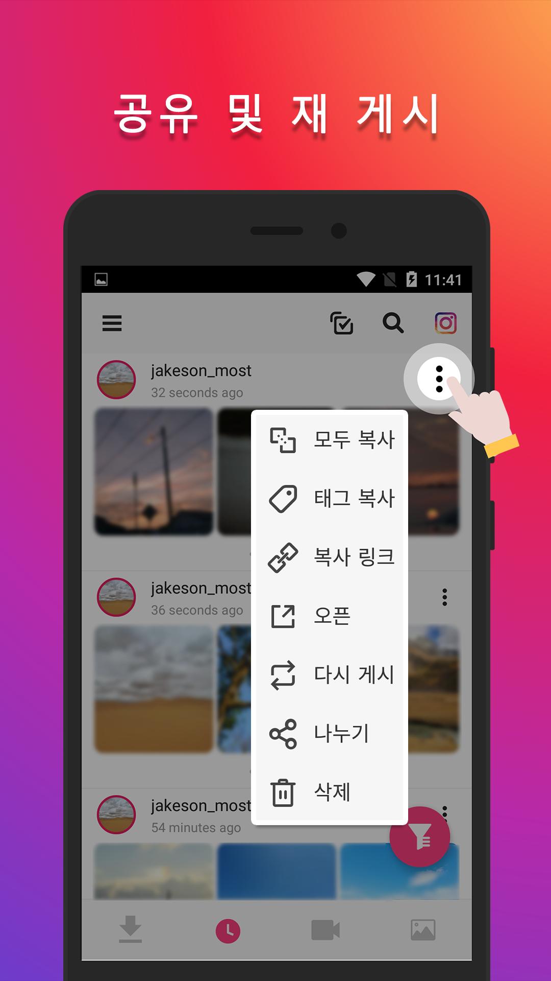 ✅ 다운로드 한 사진 또는 비디오 공유 및 다시 게시 지원