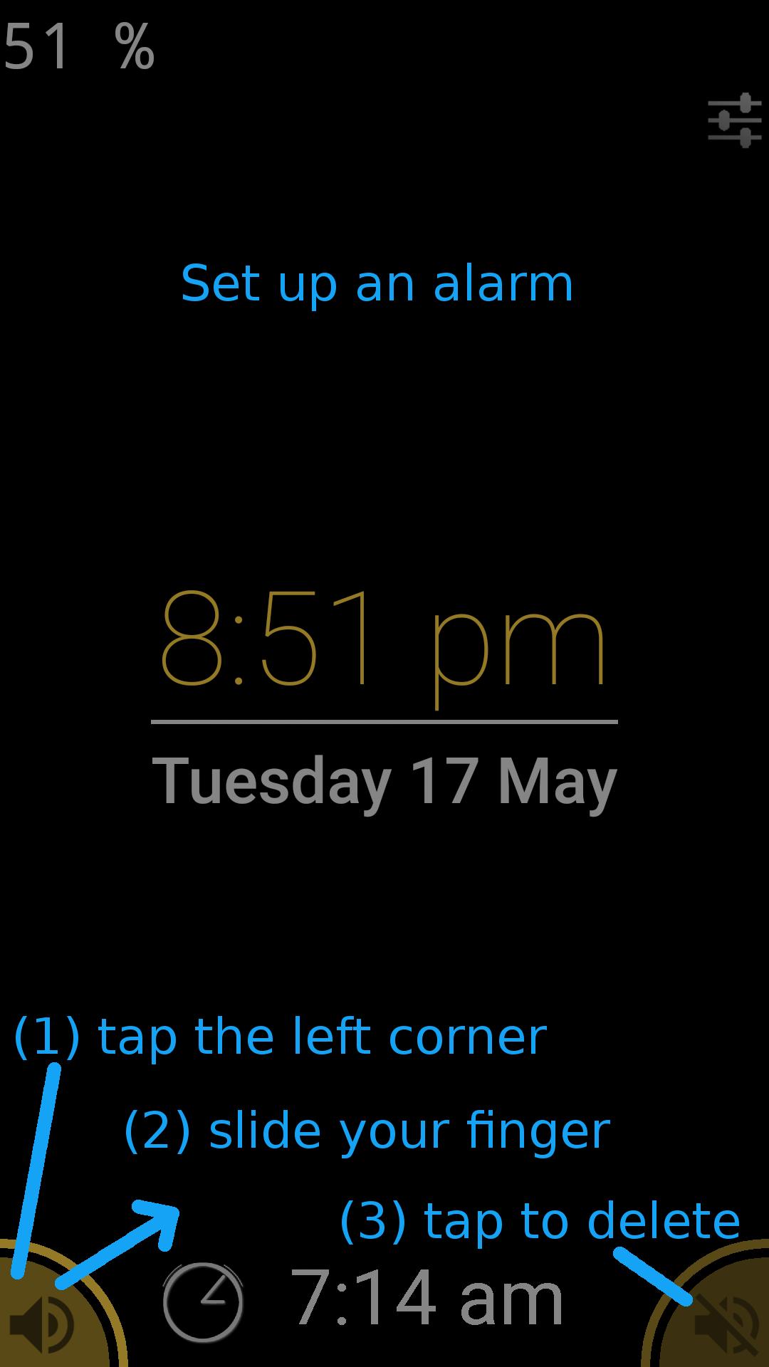 Using a swipe from the left, you can set the alarm clock. Delete it by tapping on the lower right corner.