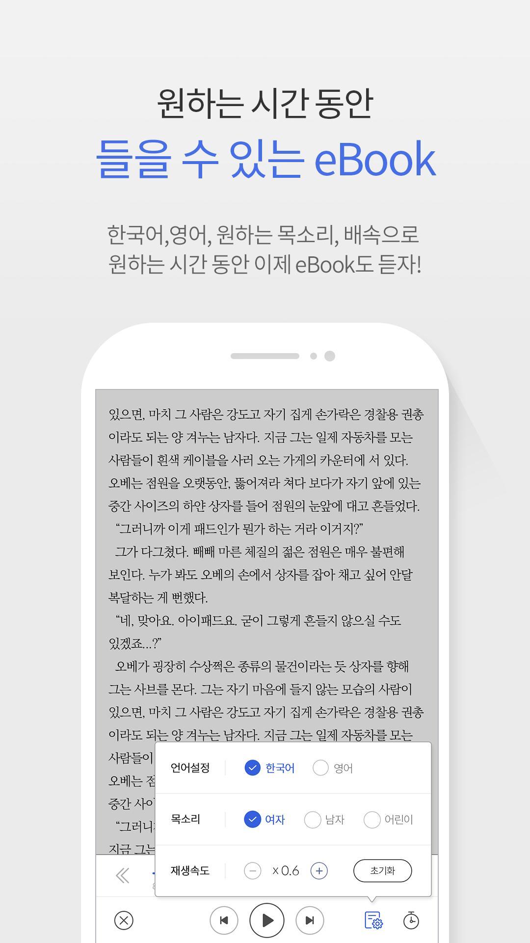 다양한 목소리로 제공되는 한국어, 영어 TTS로 보는 즐거움을 듣는 즐거움을 바꾸어보세요! 시간 설정 기능 추가로 잠잘 때도 OK!