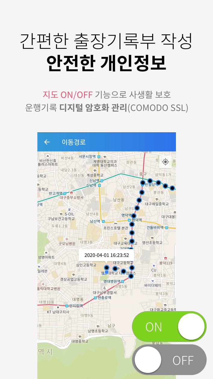* 전체 운행기록 자료 SSL 보안 인증 및 위치좌표 디지털 암호화 저장.