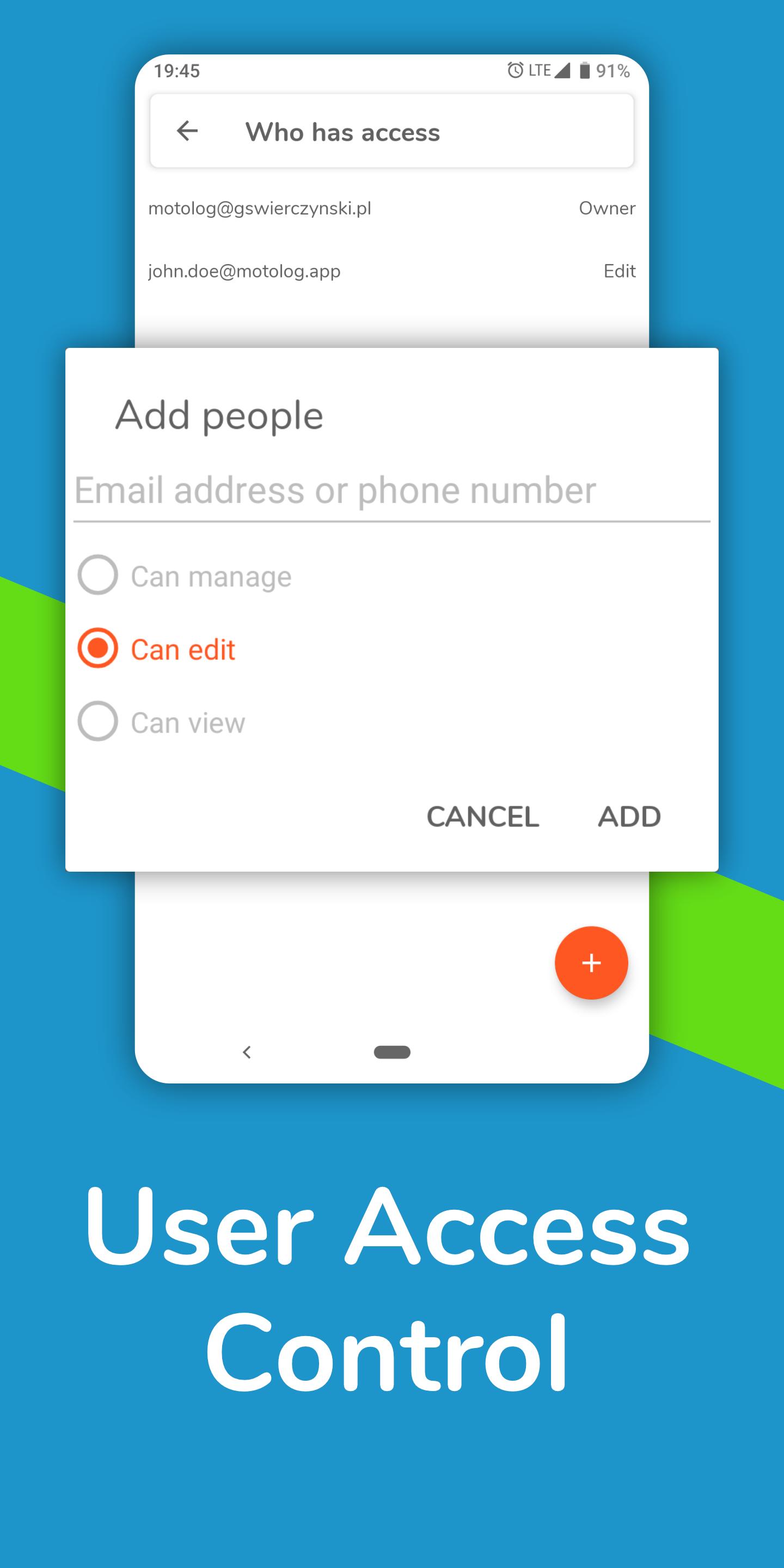 ✓ Vehicle sharing - configurable access rights for other users (read, write, manage)