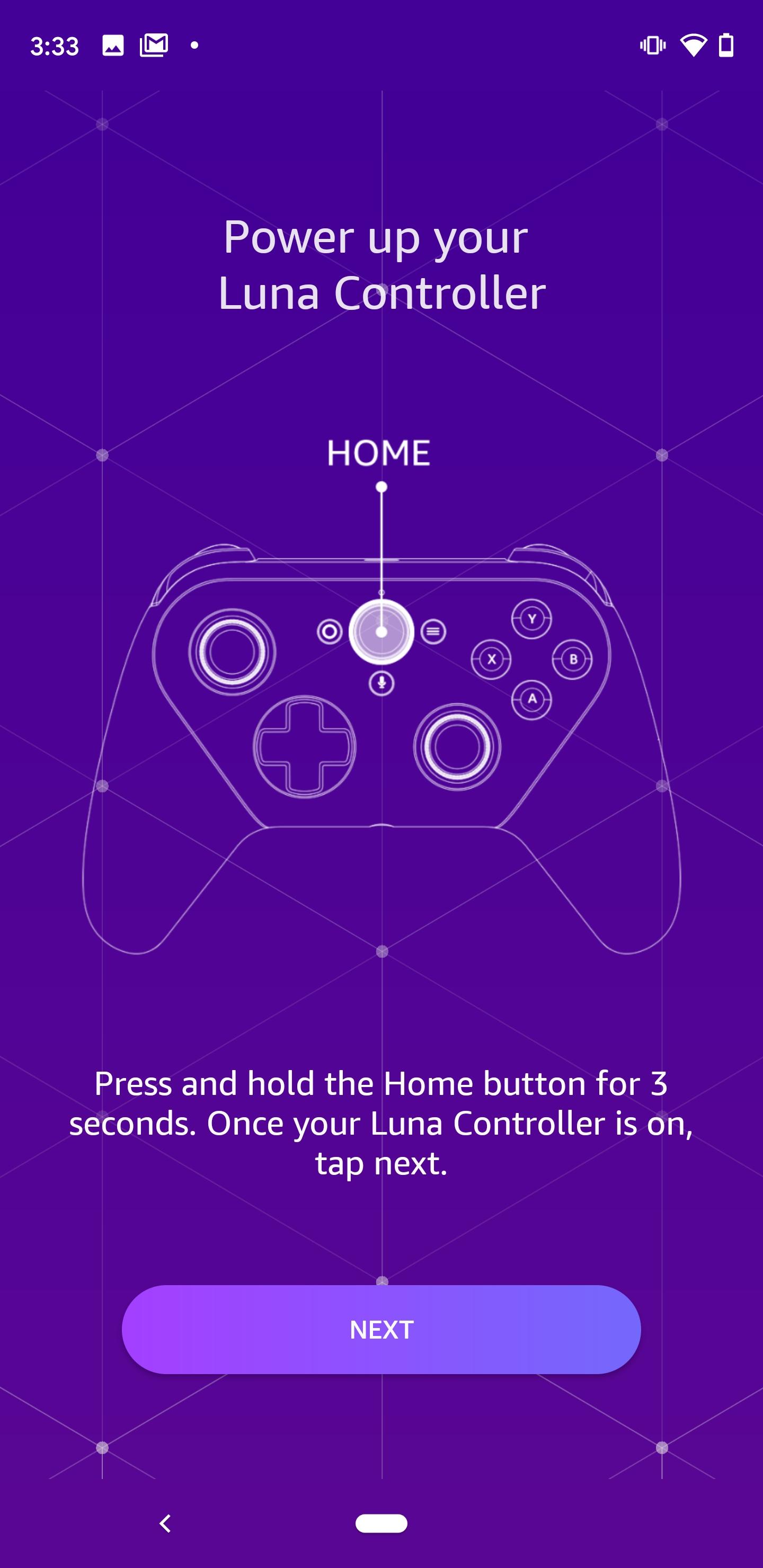 2. Power up your Luna Controller with 2 AA batteries. Press and hold the home button for 3 seconds, and an orange light will start spinning