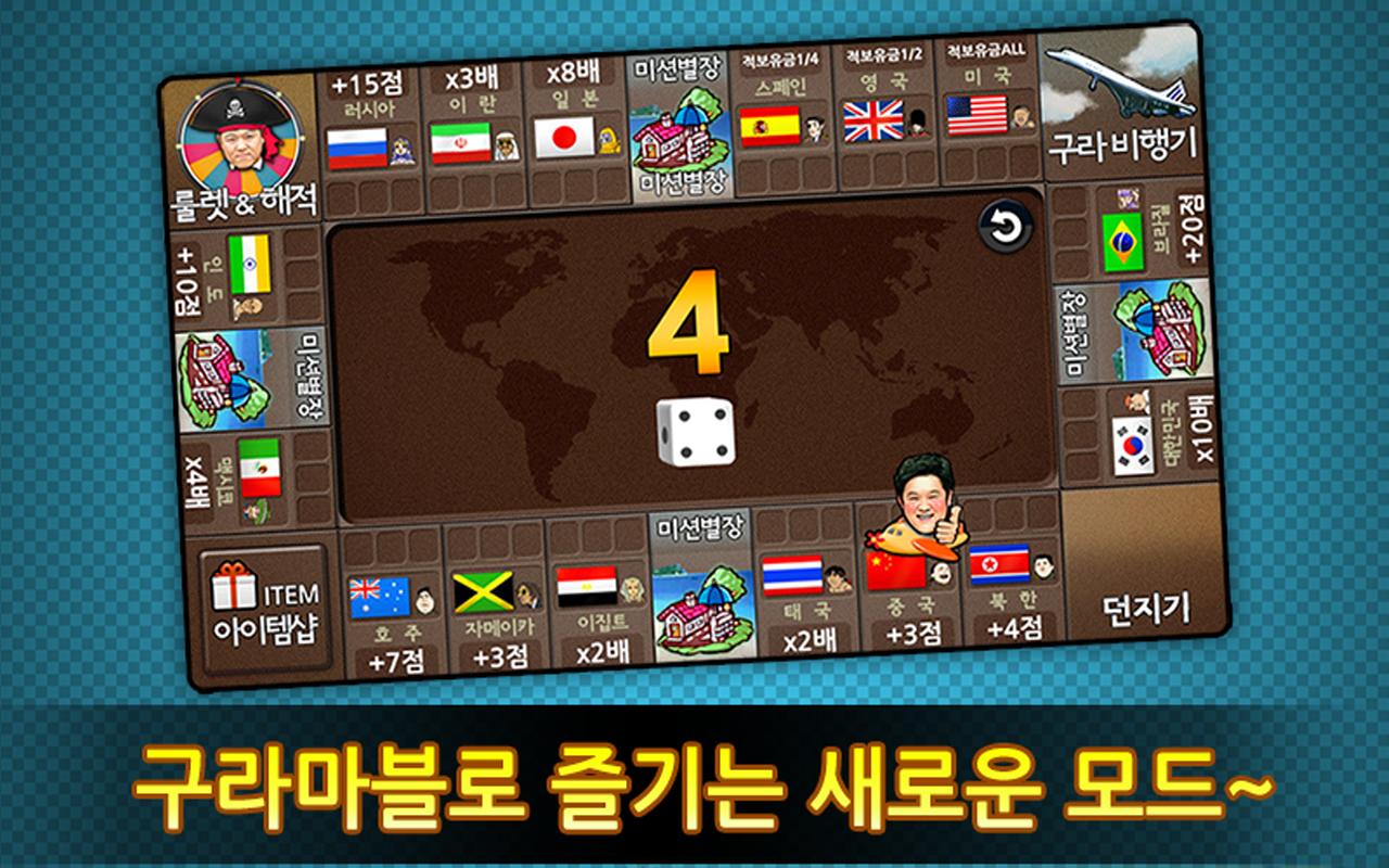 : 두근 두근 마블모드 게임판에 들어 가기전에 주사위로 아이템 및 게임에 유용한 이벤트를 만날 수 있습니다.