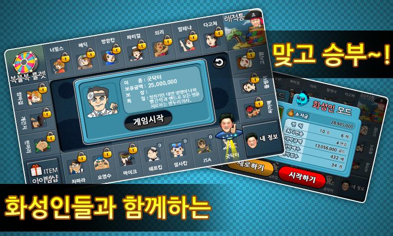 : 원하는 상대를 선택하여 맞고를 칠 수 있으며, 파산시킨 후 보상을 받으세요~