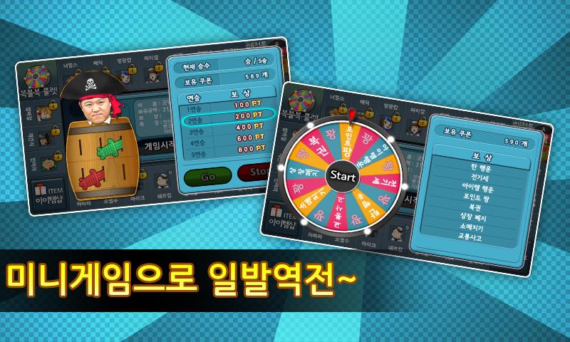 : 쫄깃한 미니게임 2종. 복불복 룰렛과 해적통 이벤트 발생 시 유저의 선택에 따라 다영한 보상이 지급됩니다.