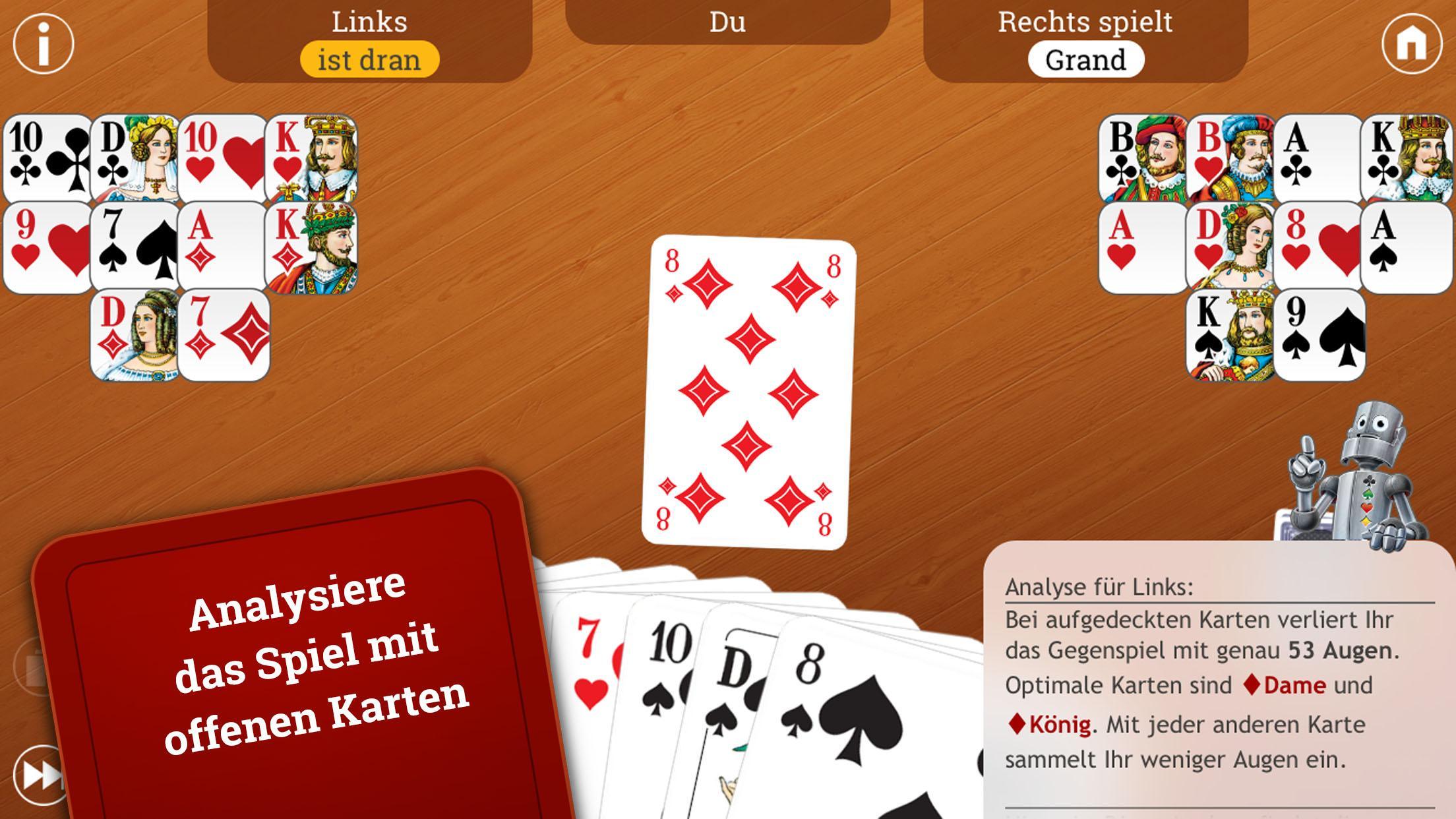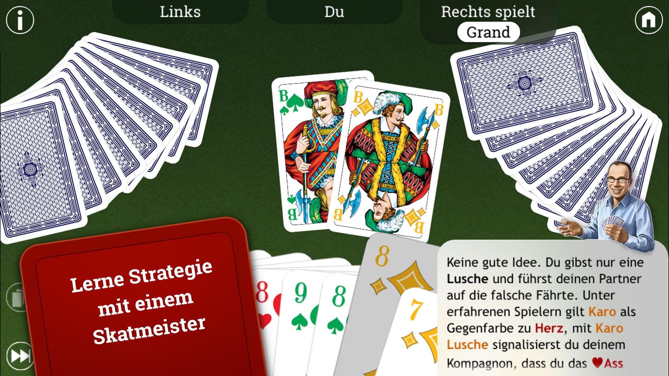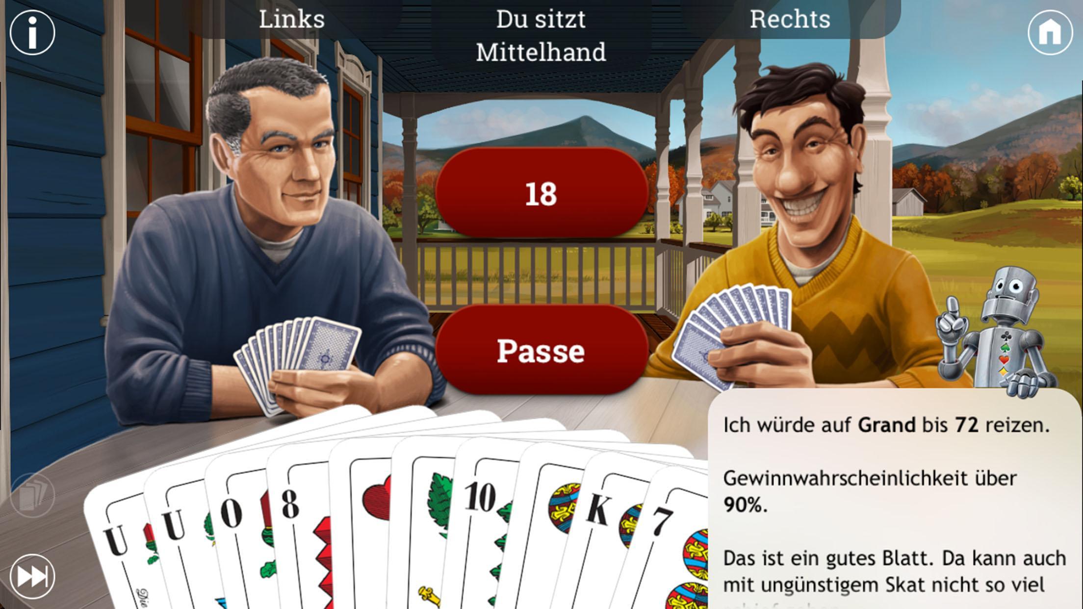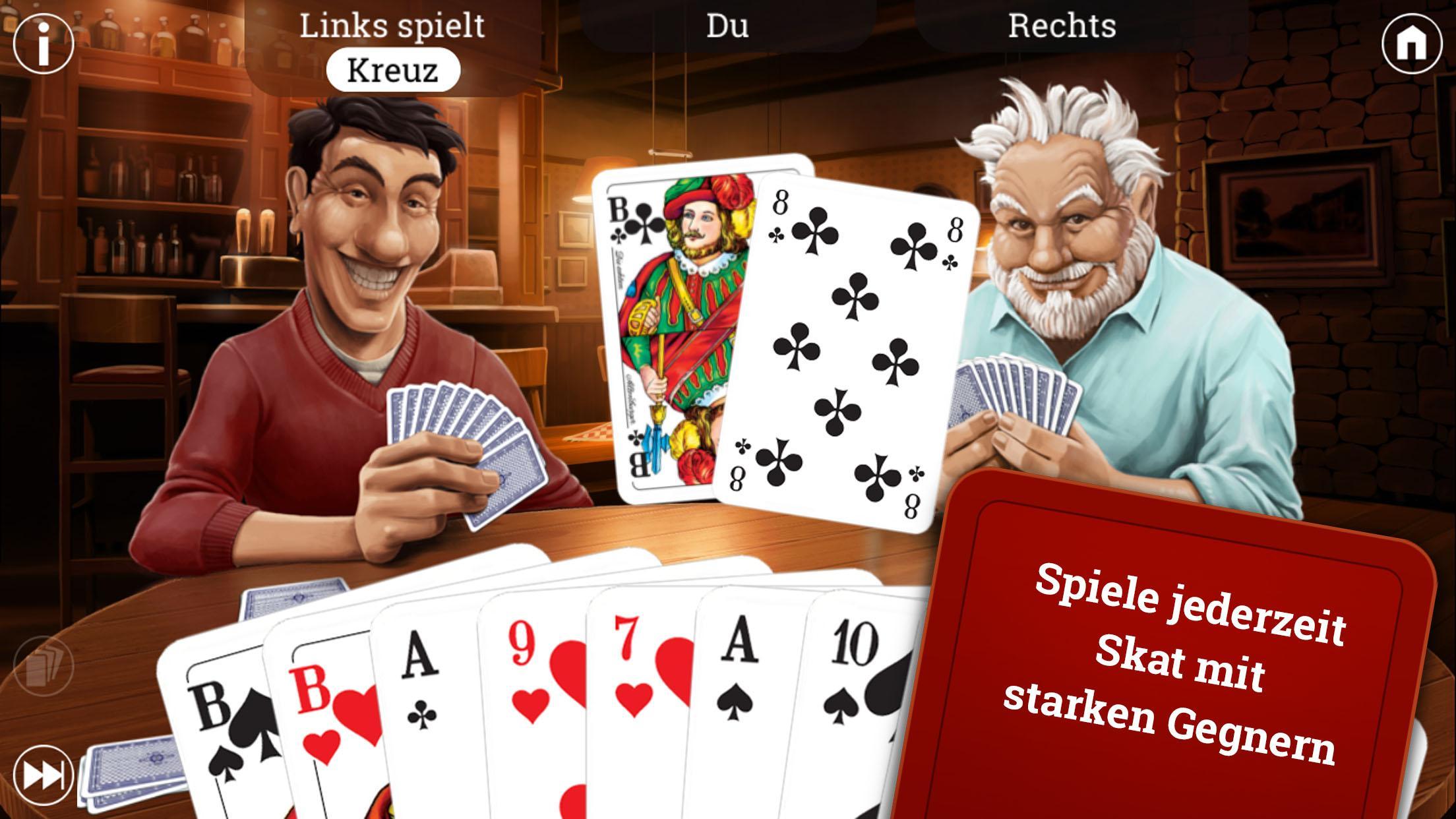 Mit unserer App versuchen wir Skat möglichst umfangreich und realistisch auf mobilen Endgeräten wiederzugeben. Die App richtet sich nicht an Kinder, sondern ist für Erwachsene konzipiert. Nach deutschem Recht ist Skat kein Glücksspiel. In unserer App gibt es kein Geld und keine Preise zu gewinnen. Spielpraxis und/oder Erfolg bei Kasinospielen ohne Gewinn ("Social Casino Games") bedeuten nicht unbedingt, dass der betreffende Teilnehmer auch bei künftigen Spielen um echtes Geld erfolgreich sein wird.