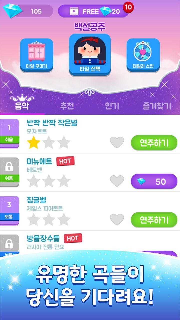 아름다운 음악을 통해 당신을 동화 속으로 안내합니다. 매직 캐슬에서는 모든 피아노 타일이 왕자 또는 공주입니다! 신데렐라, 라푼젤, 백설 공주 - 모두 피아노를 연주하는 데에 도움을 줄 수 있습니다! 새로운 공주가 항상 기다리고 있으니 당신의 최애 공주를 기대해도 좋습니다!