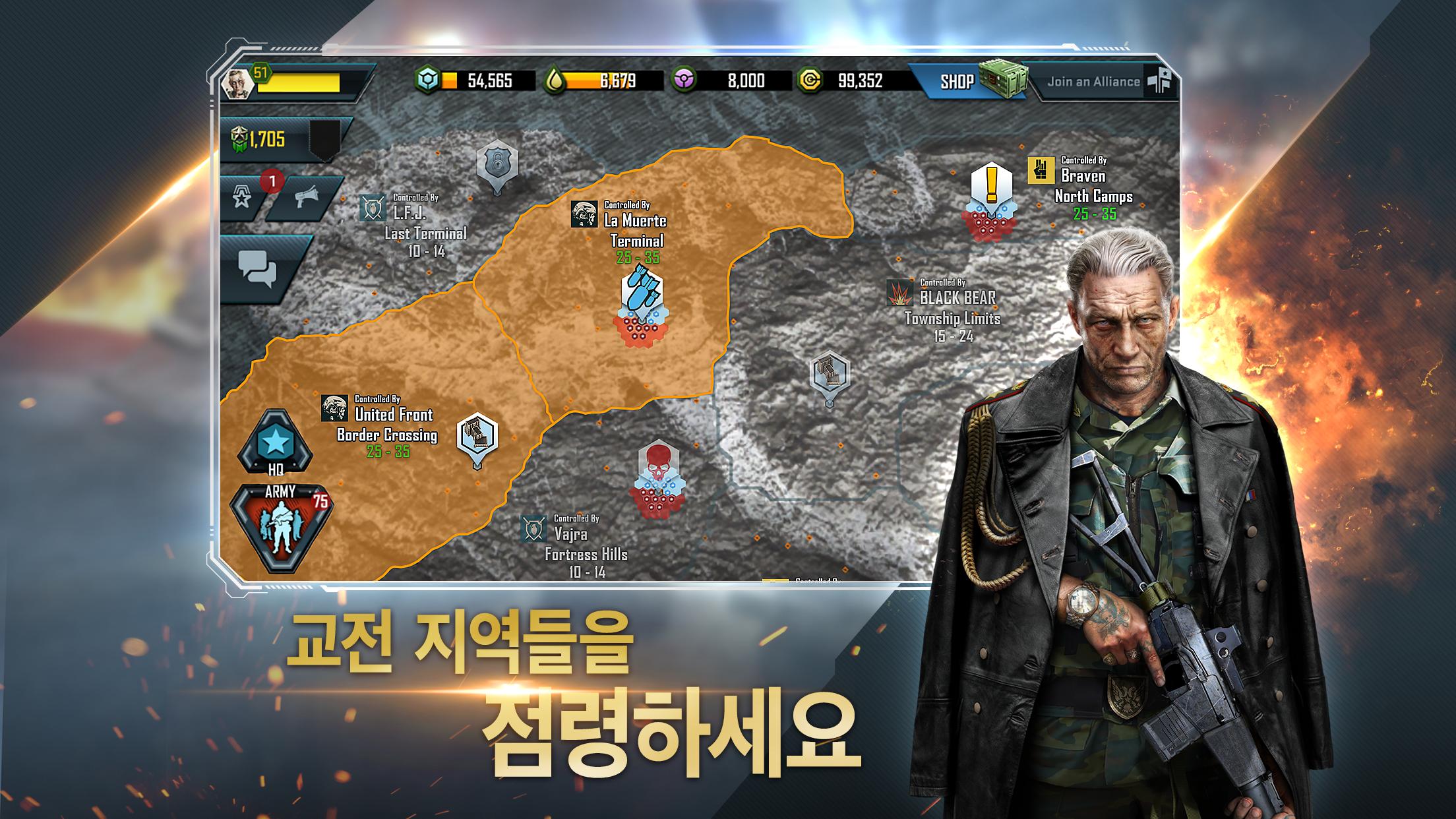 뜻을 같이하는 병사들과 전략적인 동맹을 맺고 전장에서의 치명적인 타격을 위한 전투전술을 짜세요. 또는 라이브 전세계 채팅을 통해 동맹 지휘관들로부터 조언을 얻으세요. 동맹에 참가하시는 분들은 이 전쟁으로 피폐해진 세계 속을 더 잘 헤쳐나갈 준비가 되어계신 분들입니다.