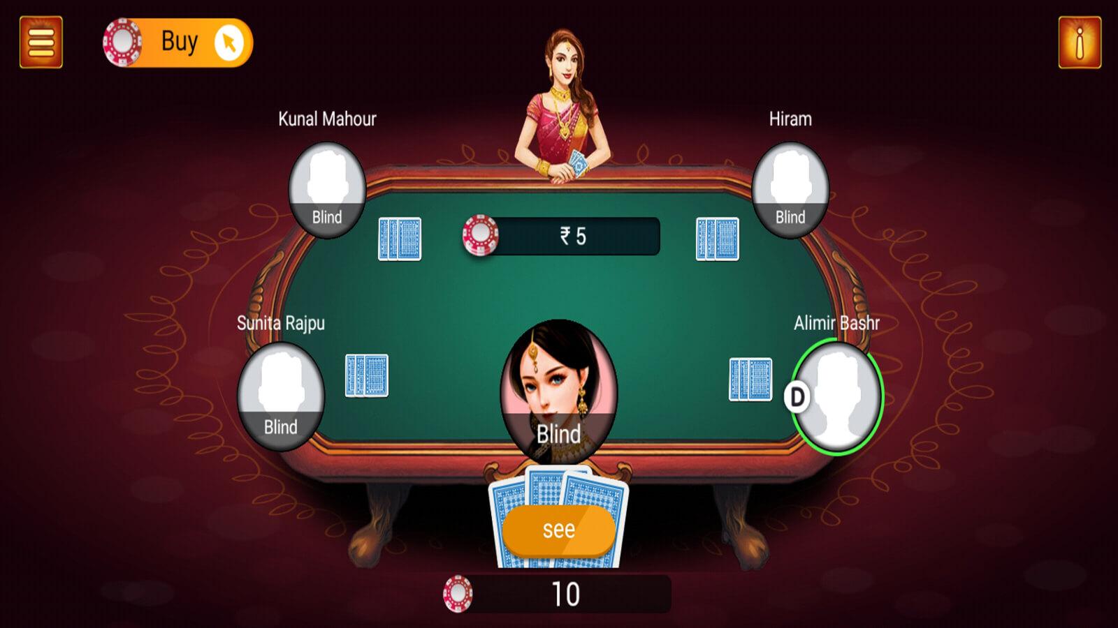 Play Poker Design Style: Teen Patti Moment is played with 3 cards & known as Flash, Flush, 3 Patti. A Teen Patti table can have up to 5 players. Winning depends on your cards & moves.